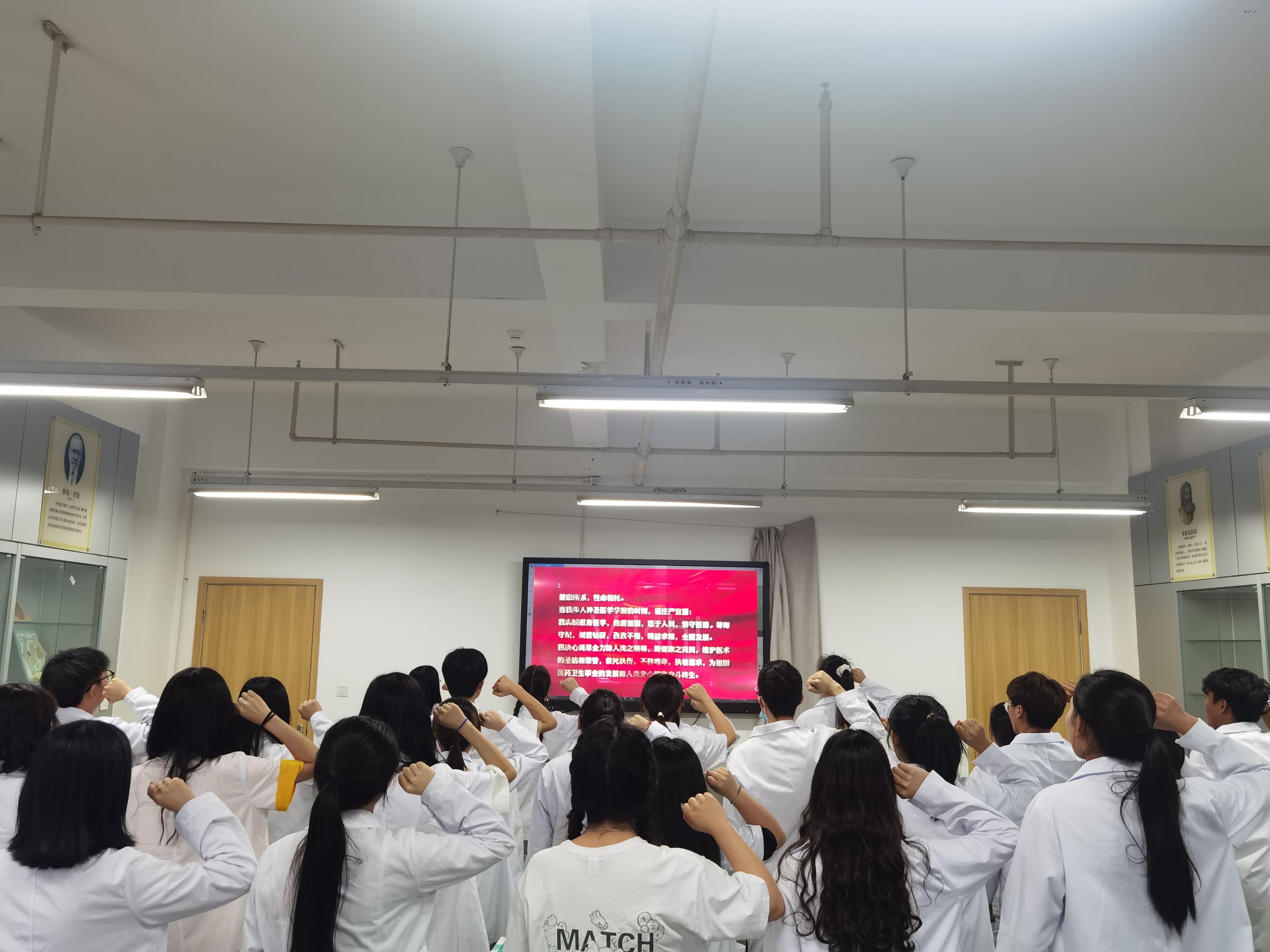 第二环节由李老师结合自身的职业经历,给大家分享职业信念、职业初心、职业修养,随后带领医学专业的员工一起重温医员工誓言,带领护理专业的员工一起重温南丁格尔誓言,感受职业精髓。第三环节为教师引导员工展开讨论,分享自己的入学初心、职业初心和对未来的期望,让同学之间彼此交换信息,感受职业信念的高度。