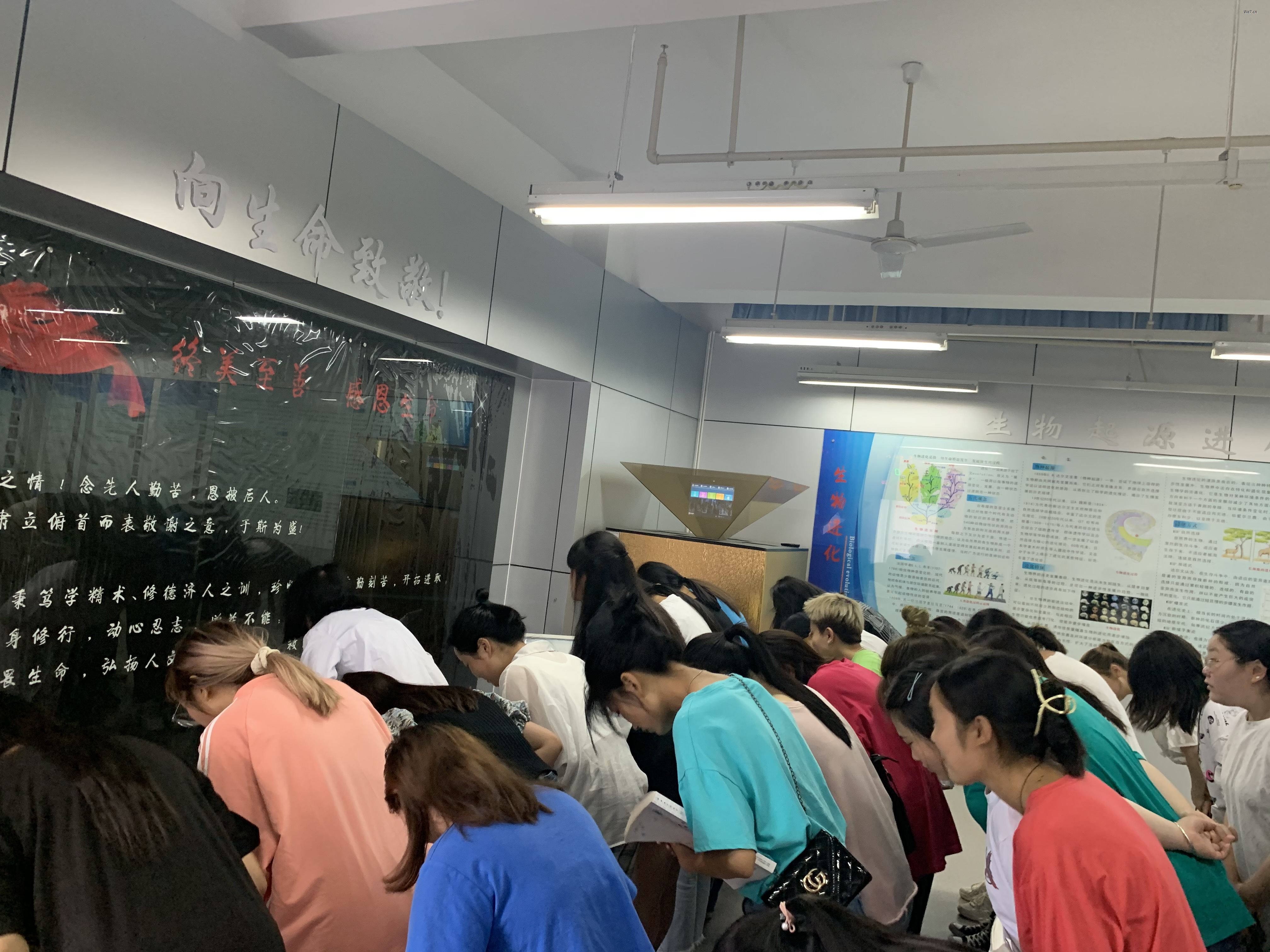 每场活动均分为四个环节,第一环节由李明蓉老师带领员工们在馆内感恩教育区开展了感恩教育活动,通过“大体老师”的故事,阐释无私奉献的精神,感染同学们,让他们由心底萌出感恩之心,在通过感恩仪式进行情感表达。在胚胎展区,李老师通过将胎儿发育过程与母体反应结合,将致畸敏感期与致畸防护结合,结合5月的“母亲节”“父亲节”将感恩进一步深化,同时引入专业知识,拔高健康的高度,促进仁爱职业素养的培育。