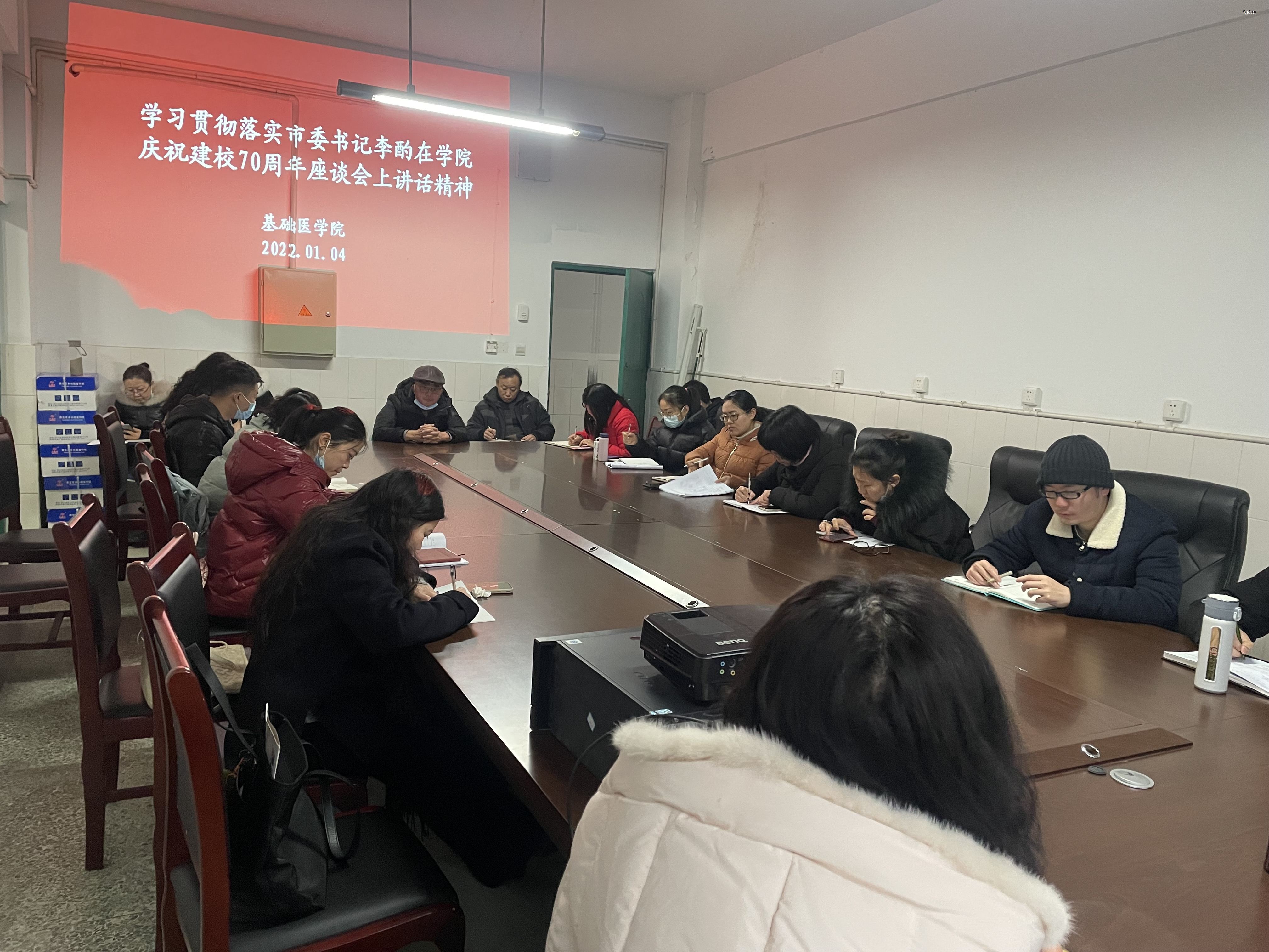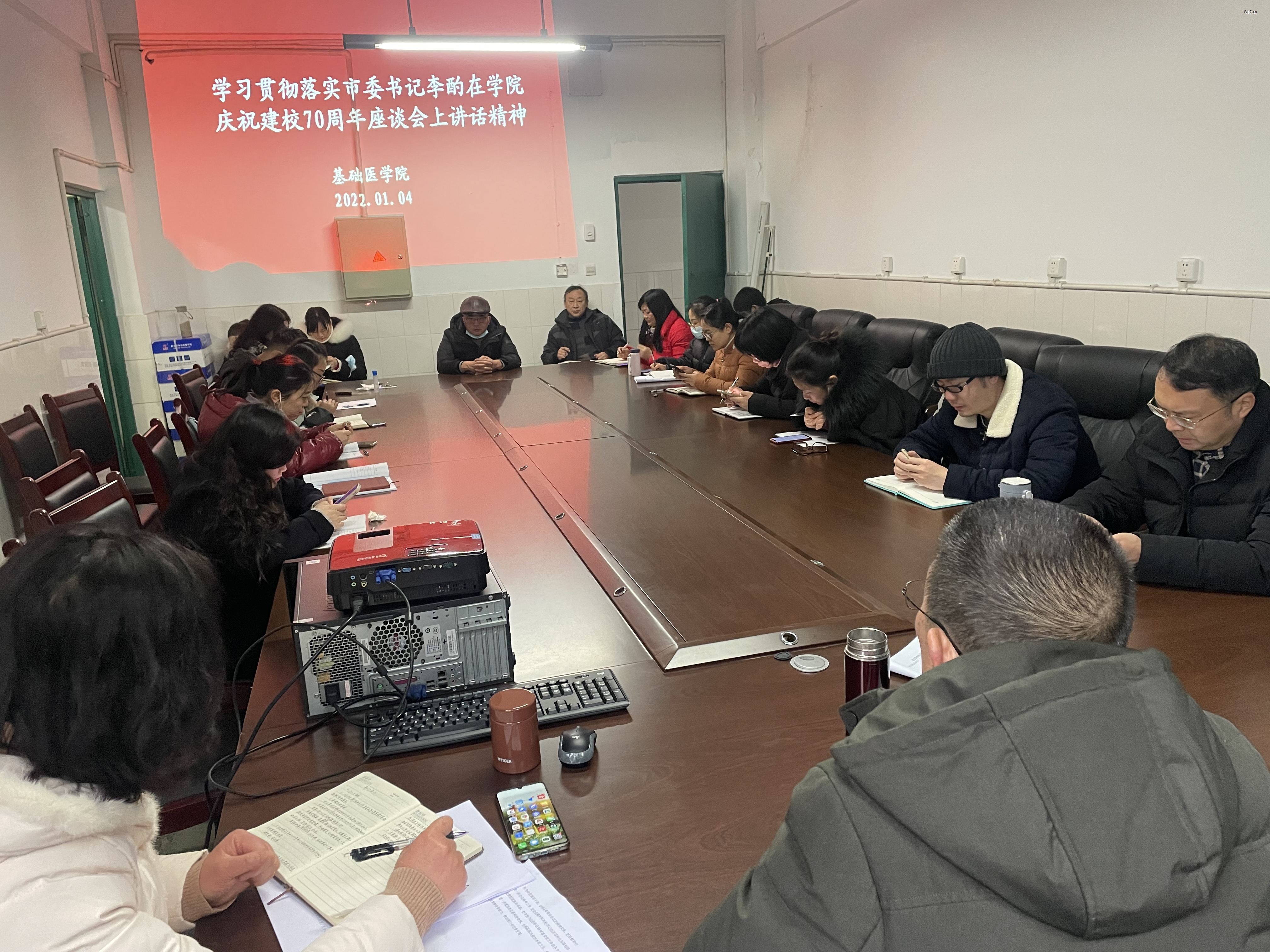 1月4日上午,太阳集团tyc151在青年路D206会议室召开会议,传达学习市委书记李酌在学院庆祝建校70周年座谈会上讲话精神,讨论研究贯彻落实措施。太阳集团tyc151直属党支部书记孙玉锦领学全文,全体教职工参加。