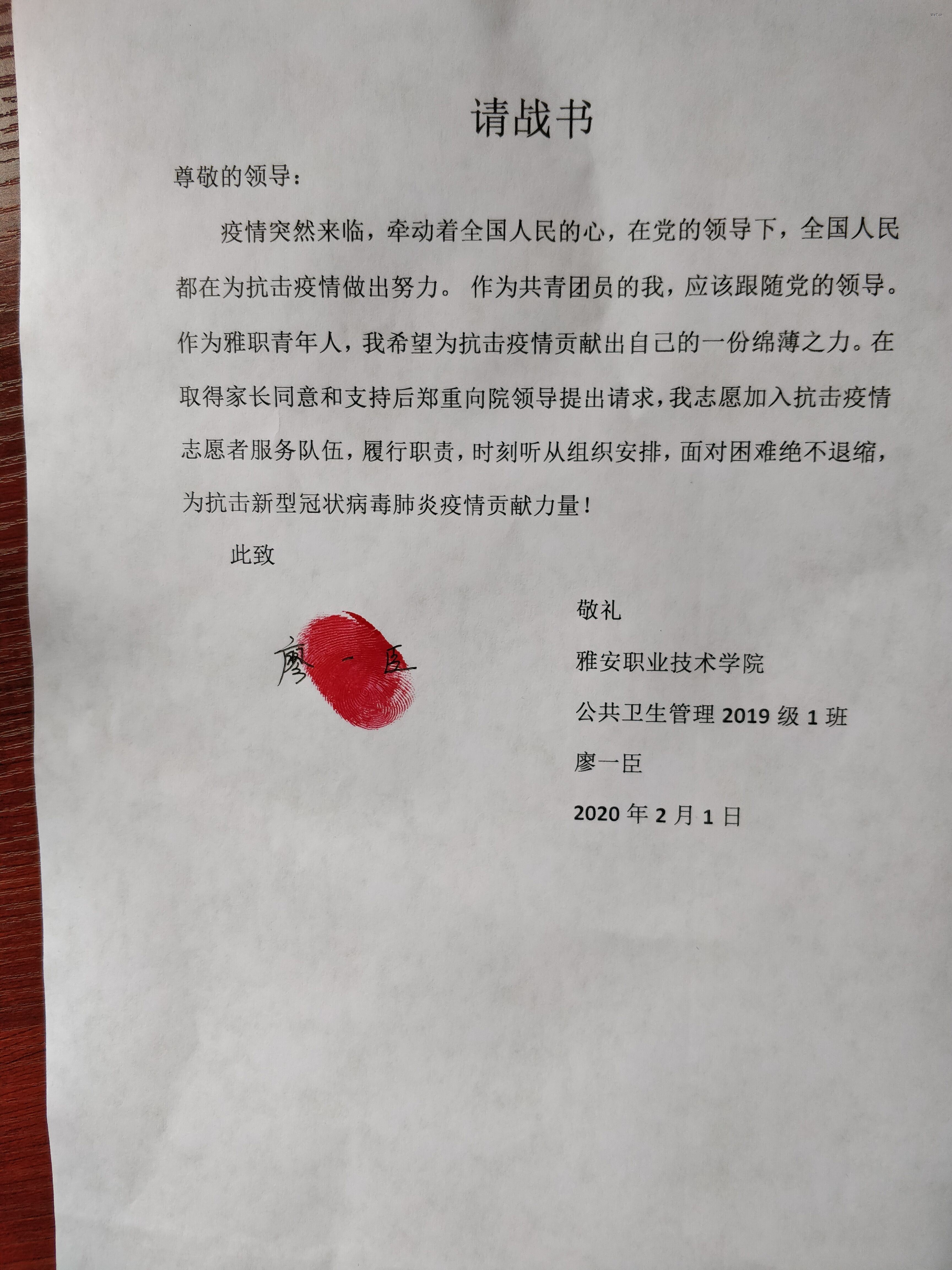 在第一时间,国家制定相关措施抑制疫情的蔓延,全国各地积极响应,人民群众都在家做自我隔离。在家的期间我们秉承着能不出去就不出去的思想,为国家的疫情防控做出努力。作为老员工,同学们的“宅”家生活也是丰富多彩,有的同学在家锻炼,有的同学在家学习,有的同学借此机会在家学做饭,我们开玩笑说疫情结束后可要多出好多大厨了。二十年来的学习生涯使得大多数老员工没有体会过生活中的细小乐趣,而这次在家便可以使得很多老员工感受生活的乐趣。在家期间我也随时关注着疫情的时事动态,其中最令我触动的是张文宏主任在接受采访时说的“一线岗位全部换上党员,没有讨价还价”,坚决跟党走,青春心向党,身为入党积极分子的我也在这一刻明白了一个共产党员的奉献精神。一线抗“疫”党旗飘扬,在党的领导下无数的医务工作者和公共服务工作者投身在抗击疫情的最前线,正是因为在党的正确指挥下,疫情才得以快速控制。在新闻联播里看着他们忙碌的身影,我突然觉得自己作为太阳集团tyc151公共卫生管理专业员工,也是辅导员积极培养发展的一名入党积极分子,并担任班级团支书,是时候做一些事情,用微薄之力支持抗疫,在得知学校可以报名抗击疫情志愿者的消息时,在家人的鼓励和支持下,我提交了自己的抗疫请战书。