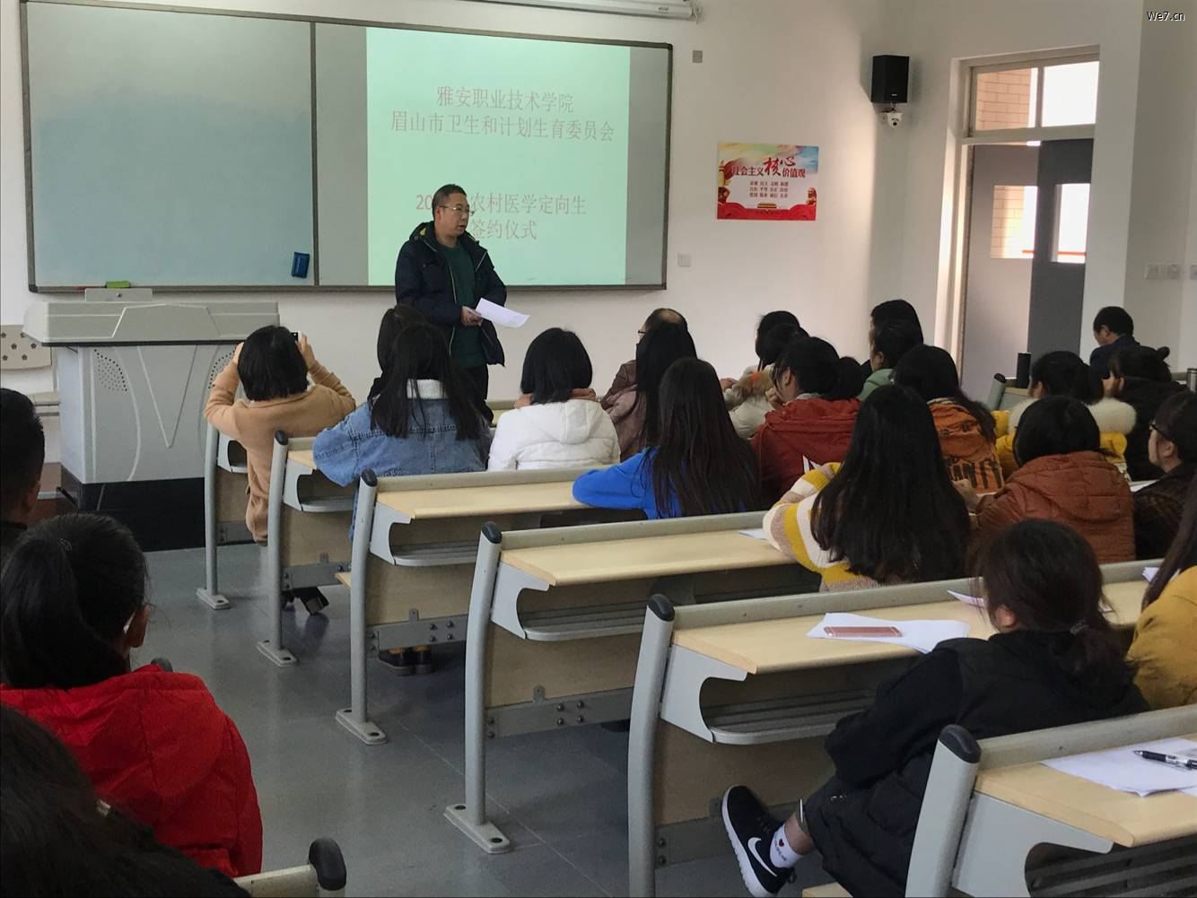 签约仪式上,宋峰表示希望定向医员工要珍惜来之不易的学习机会,顺利地完成学业,为工作打下良好的基础。胡燕详细地为同学们介绍了眉山农村医员工定向培养、定向就业的有关政策,并向同学们发放了定向培养就业协议书,耐心地为同学们和家长解答疑问。薛正毅介绍了学院近年来培养的雅安农村定向医员工的发展好形势,鼓励同学们抓住机遇找准定位,怀揣感恩的心,努力学习专业知识,扎实医学基本技能,为自身职业发展做好规划和准备。在仔细研读眉山市农村医员工定向培养就业协议之后,50名同学按区县完成了签约。