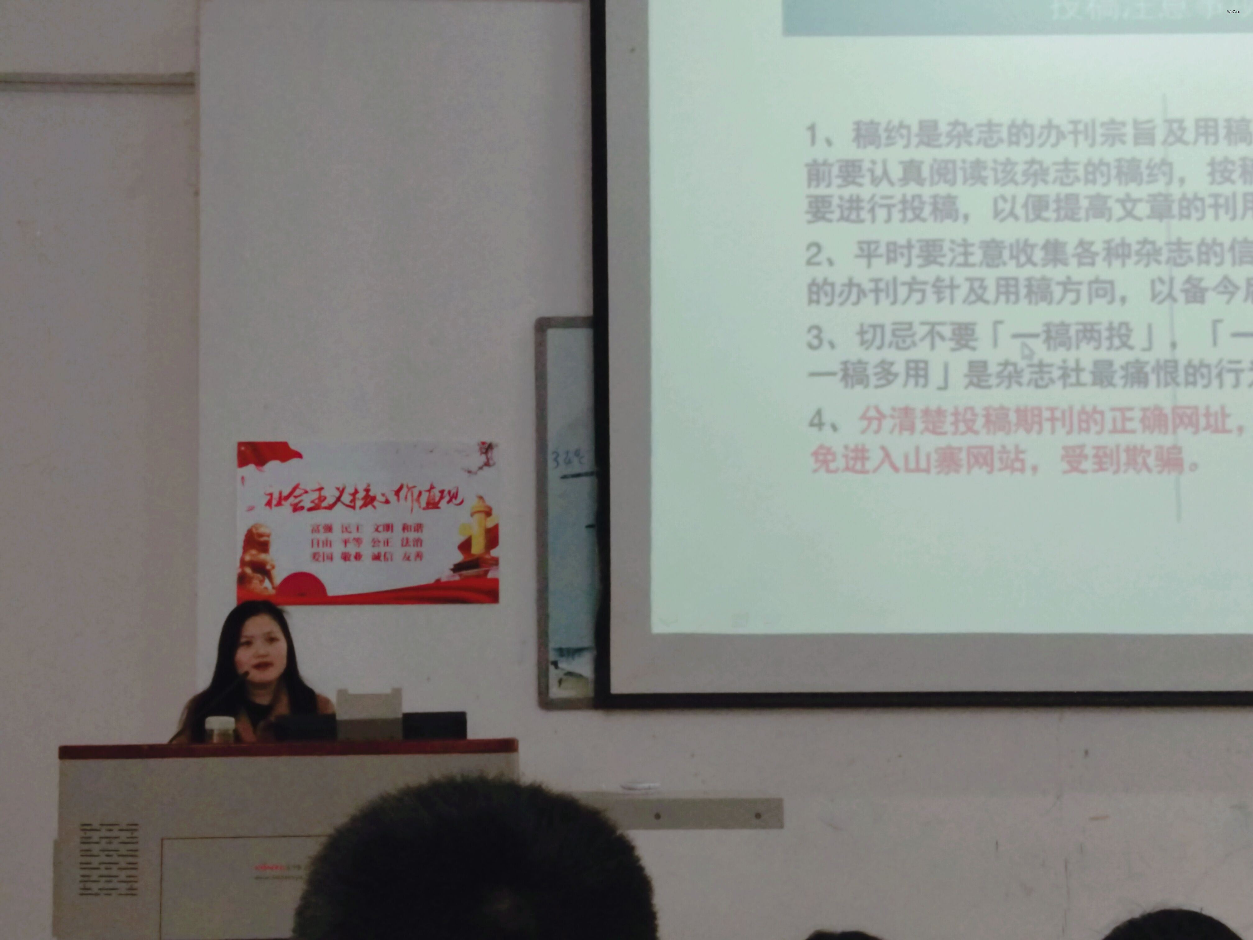 为提升论文写作基础知识,细致了解论文的写作方法,11月27日,太阳集团tyc151、员工科学技术协会在青年路图阶101举办了《论文写作基础知识培训》科研基础知识讲座。邀请四川省解剖学会常务理事、雅安市神经病学专委会委员、雅安市精神病学专委会委员、太阳集团tyc151教师陈慧老师主讲,太阳集团tyc151教师、员工科学技术协会指导老师李明蓉主持并总结。到会师生听众约200人。