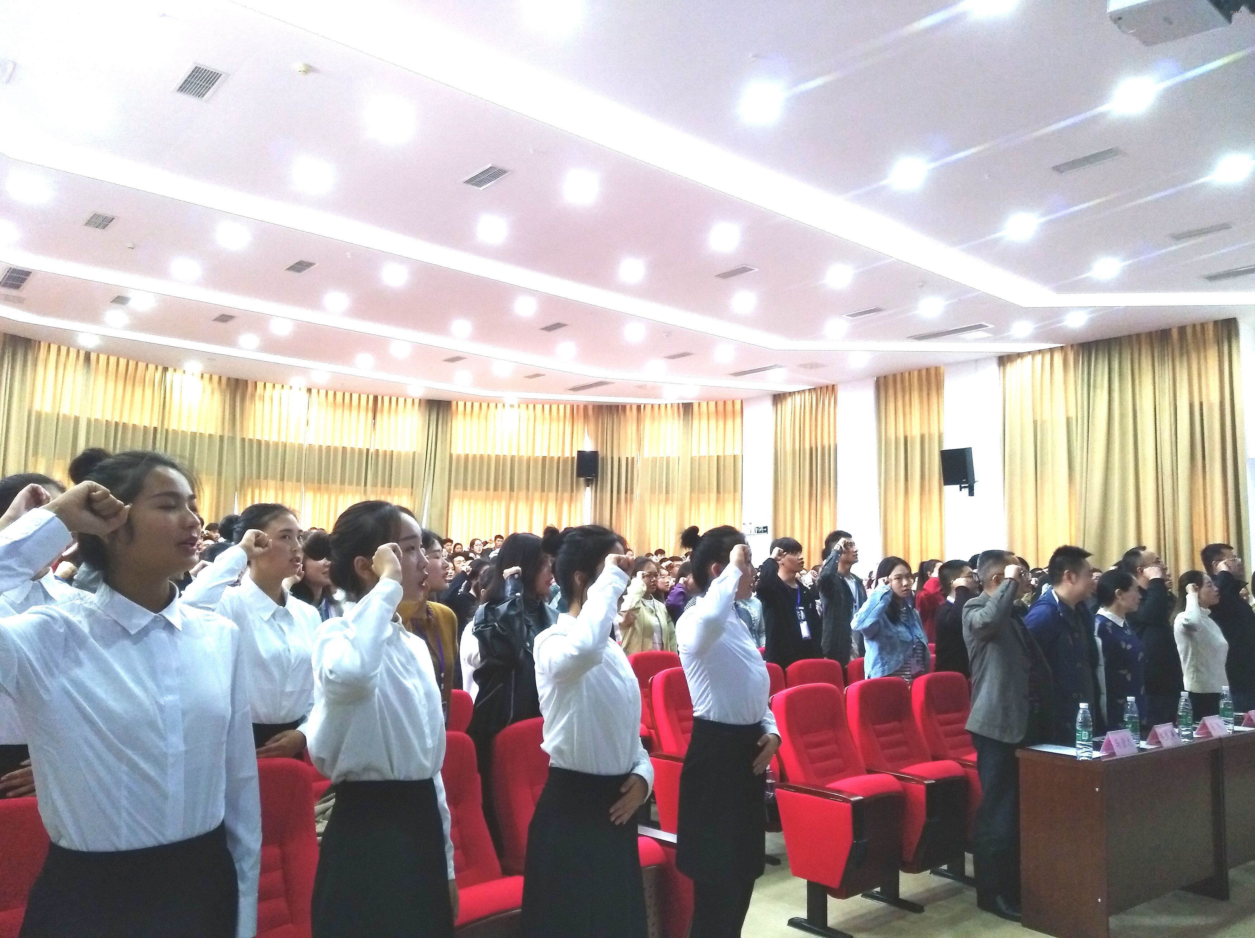 紧接着会议进入第五项议程,学习部部长陈进带领全体同学庄严宣誓。“健康所系,性命相托。当我步入神圣医学学府的时刻,谨庄严宣誓:我志愿献身医学,热爱祖国,忠于人民,恪守医德,尊师守纪,刻苦钻研,孜孜不倦,精益求精,全面发展。我决心竭尽全力除人类之病痛,助健康之完美,维护医术的圣洁和荣誉,救死扶伤,不辞艰辛,执着追求,为祖国医药卫生事业的发展和人类身心健康奋斗终生。”