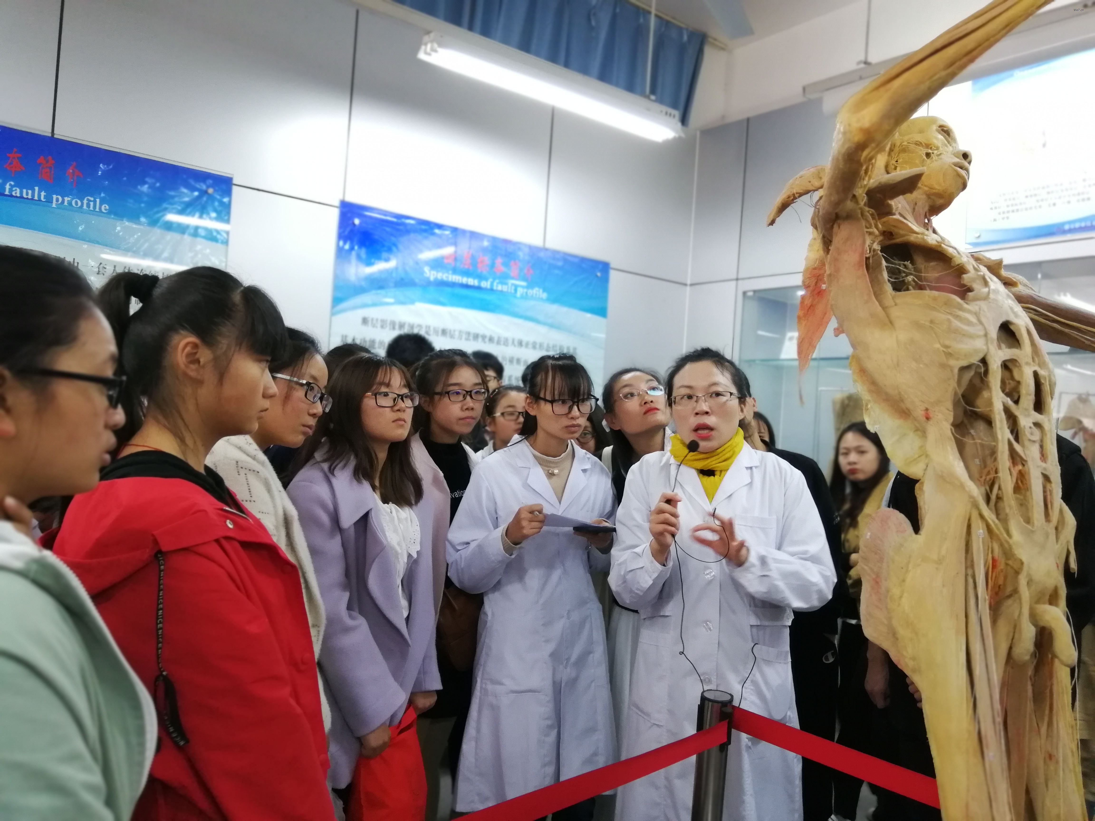 怀着好奇,带着憧憬,同学们踏入了神秘的人体生命科学馆,开始一段追寻生命奥秘之旅。进入展馆的第一件事,就是李老师带领我们面向感恩墙遗体捐赠者鞠躬鞠躬致敬。正是因为他们的无私才让我们能够直观的认识生命,了解人体,掌握医学知识。随后,老师为我们讲解了胚胎标本,从受精卵开始,胚胎发育第一周,第一个月,三个月……一直到第十个月婴儿刚刚出生,不禁感叹生命起源发育的神奇与伟大。再往后我们看到的是一些可怜的畸形婴儿标本,各种各样的畸形儿标本泡在溶液中,让我们不禁感慨拥有一副健康的身体是多么幸福。胚胎标本厅之后是陈列人体各个器官的展厅。为我们展示了由生物塑化技术所保存的人体的心血管系统、神经系统、内脏系统等。这些标本让我们对人体有了更加清晰的认识和了解。再往后是人体冠状切片标本区,数十页薄薄的人体标本,从胸侧到背侧,清晰的展示出人体各个断层的器官,肌肉,组织,人体的复杂让我们的心灵无比震撼。
