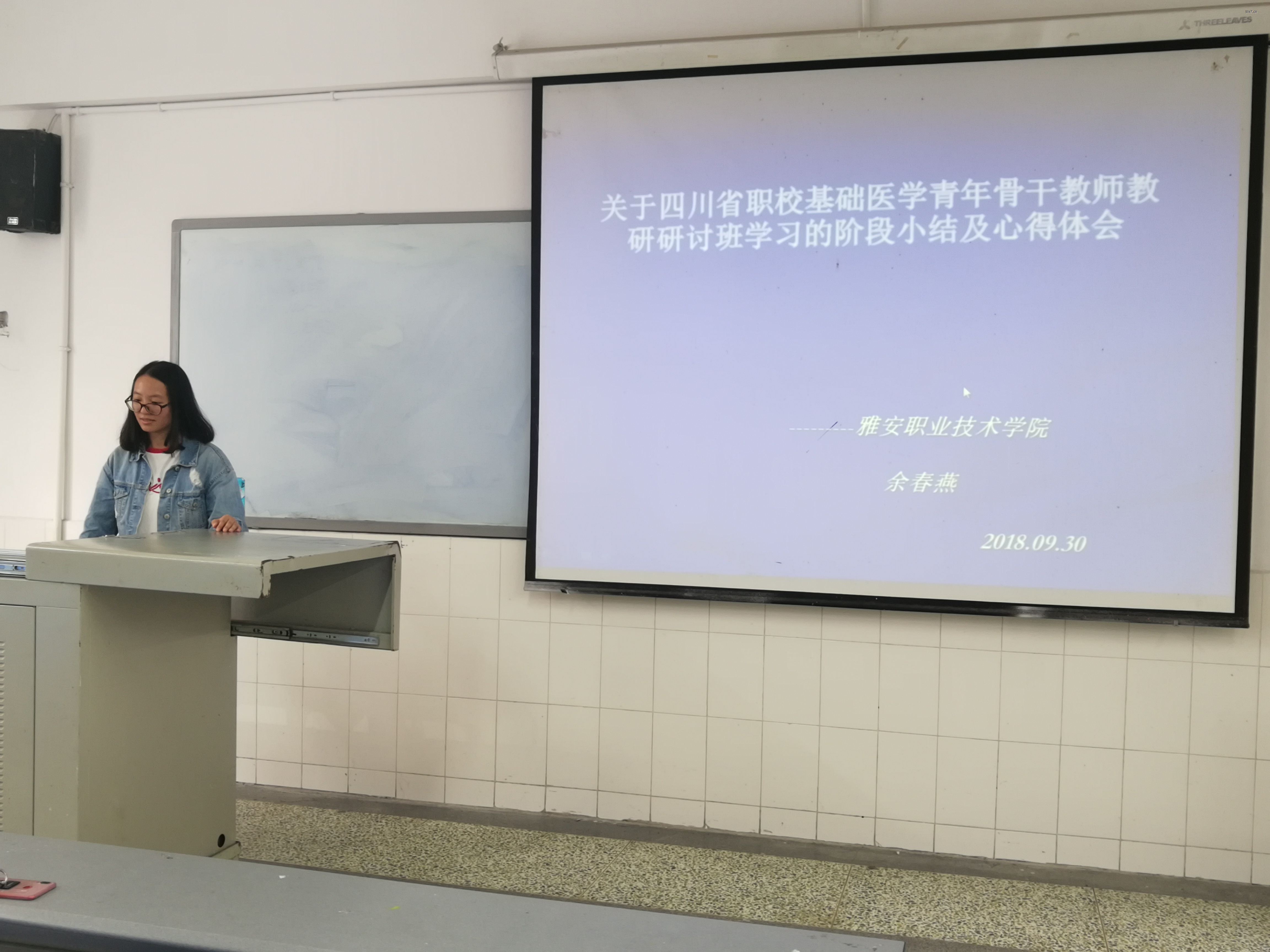 2018年09月29日下午,太阳集团tyc151生理教研室的全体老师在公司青年路校区开展了教研活动,本活动有两个主题,一是由余春燕汇报参加“四川省职校基础医学青年骨干教师教研研讨班”学习的阶段性心得汇报,二是根据余春燕汇报内容进行研讨。