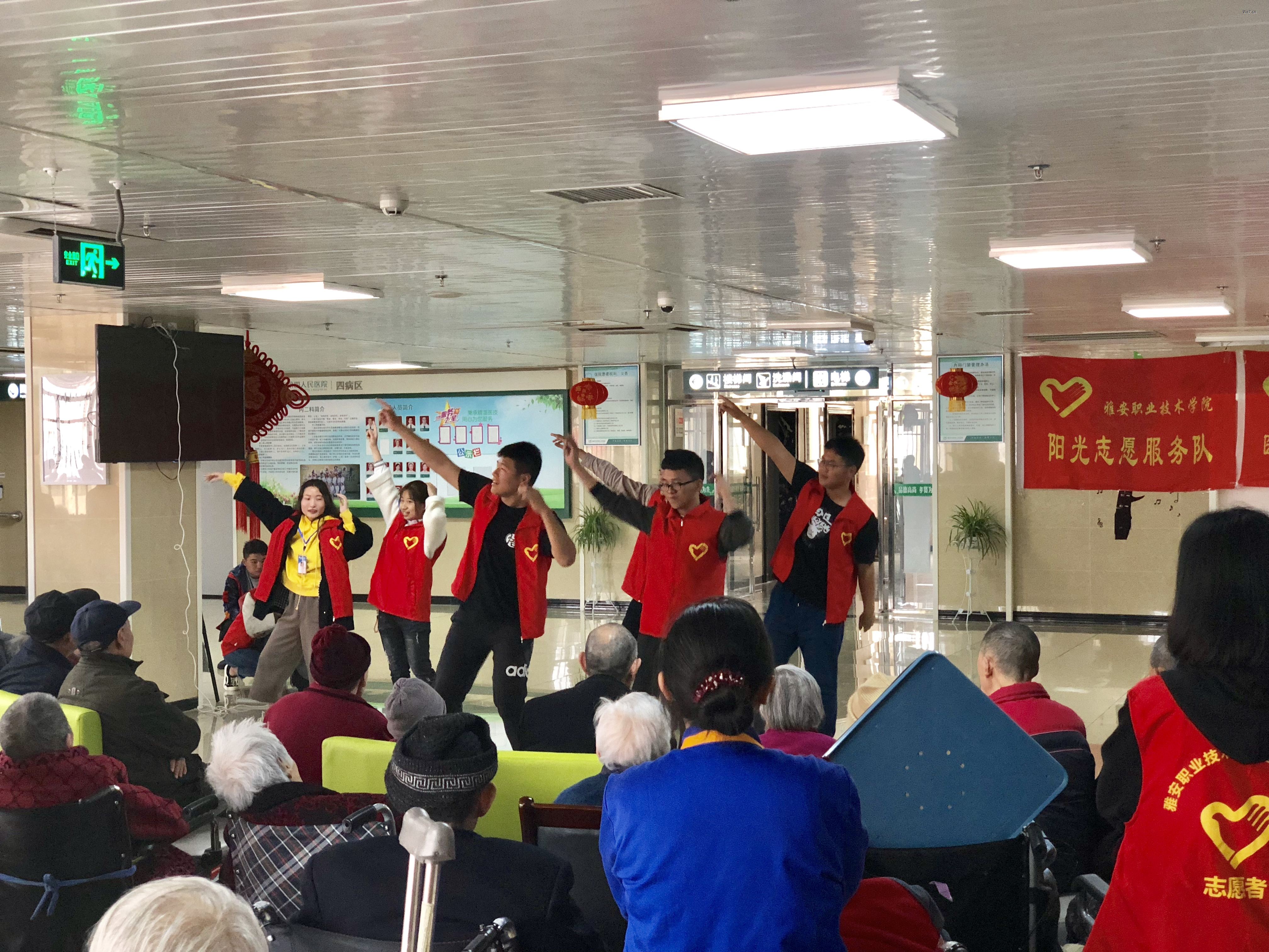4月13日下午,太阳集团tyc151医学系团总支副书记张晓惜老师带领医学系青志协阳光志愿服务队34名志愿者,来到了雅安市第四人民医院颐养楼内二科,开展“阳光敬老”为主题的志愿服务活动。下午13:15,志愿者们在雅职院育才路、经开校区门口分别集合前往目的地,14:44全员到达活动地点。志愿者们各司其职,井然有序的推送老人们到活动现场、布置演出现场、与老人们聊天。3点整,志愿者们开始了丰富多彩的文艺节目表演,文娱部古典舞《采薇》、流行舞蹈《海草舞》,实践部小品《反转》,宣传部话剧《奶奶的名字》,志愿者们满怀激情,载歌载舞,为科室的老人们奉献了一场形式多样、风格各异、精彩纷呈的文艺节目演出,表达对爷爷奶奶的深深祝福。在观演过程中,老人们不时地用掌声为演员们拍打节奏,热情互动,全场充满了欢乐喜庆的氛围。
