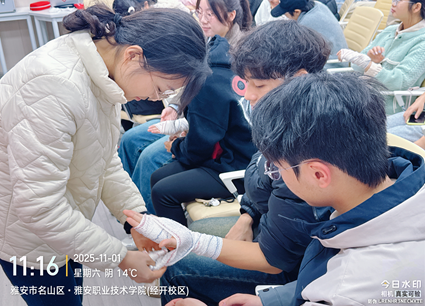在实操演练阶段,培训现场精心设置了模拟人体模型,每位老师都耐心细致地手把手指导学员进行心肺复苏按压、人工呼吸操作,并针对按压深度、频率等细节问题进行及时纠正;同时,现场还发放了医用纱布、绷带等模拟教具,学员们分组进行实操练习,五位老师则逐一巡视指导,及时指出并纠正“绷带过紧影响血液循环”“打结位置不当”等问题,确保每位参与者都能熟练掌握并独立完成规范包扎。