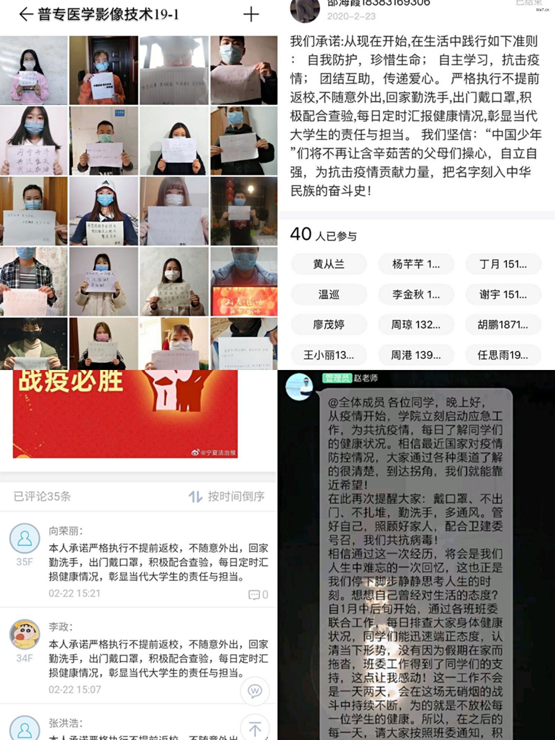 从 2月20日到3月2日在线上陆续对班团活动进行了讨论、指导和互动。各班团支书组织班级班委网络会,大家分工设计制作活动PPT、官方宣传资料、相关图片、影片、班群接龙、抢答等形式多样的互动方式来开展活动,让同学们在疫情宅家期间感受到集体的温暖,深刻认识到疫情期间除了宅家上网课,还有多样有意义的班团活动可以与大家分享和交流,极大丰富了同学们的宅家生活,使同学们在思想上更明确方向。