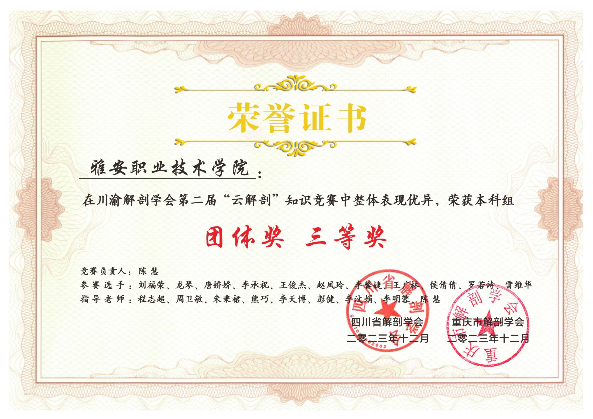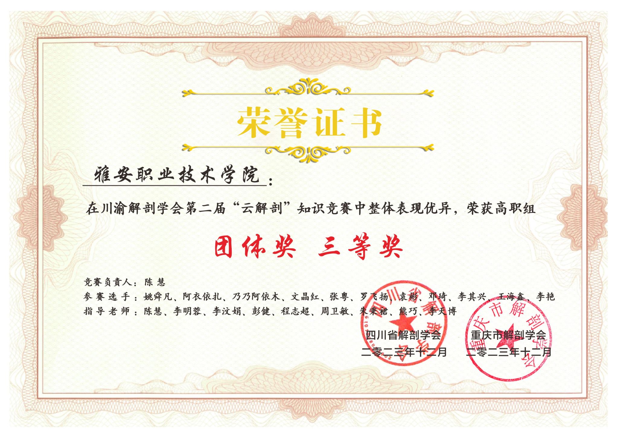 2023年川渝解剖学会学术年会于2023年12月15-17日在重庆涪陵第三军医大学召开。公司为理事会成员单位,陈慧、李明蓉两位老师参加了本次学术年会,成功入选为第十届会员大会代表,陈慧进入换届选举大会领导小组。大会对川渝第二届“云解剖”知识竞赛的获奖单位进行了颁奖,公司分别获得本科组竞赛和高职组竞赛三等奖。